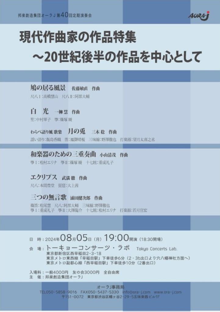 日時 2024年8月5日(月) 19:00開演(18:30開場)♪ 鳩のいる風景 佐藤敏直 作曲尺八Ⅰ:高橋慧山 尺八Ⅱ:阿部大輔♪ 白光 一柳 慧 作曲笙:中村華子 箏:篠塚綾♪ わらべ語り風 歌楽 ♪月の兎 三木稔 作曲謡い語り:飯島香織 笛:鳳声晴桜 三味線:野澤徹也 打楽器:望月太喜之丞♪ 和楽器のための三重奏曲 小山清茂 作曲箏Ⅰ:松村エリナ 箏Ⅱ:篠塚綾 十七絃:重成礼子♪ エクリスプス 武満徹 作曲尺八:本間豊堂 琵琶:大上茜♪ 三つの無言歌 浦田健次郎 作曲篠笛:松尾慧 尺八:阿部大輔 三味線:野澤徹也箏Ⅰ:重成礼子 箏Ⅱ:大澤陽介 十七絃:松村エリナ 打楽器:若月宣宏